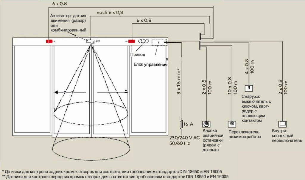 Безопасность: Система оснащена автоматической защитой от схлопывания створок и возможностью подключения полного комплекта аксессуаров для обеспечения безопасности (фотобарьеры, датчики движения, кнопки аварийной остановки).