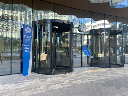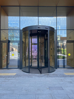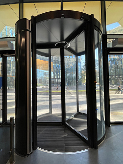 Для реализации данной задачи была выбрана револьверная дверь dormakaba KTV 3А, соответствующая всем требованиям проекта. Ее ключевое преимущество — самое тонкое канопе (потолок револьверной двери) на рынке автоматических дверей - всего 100 мм, что обеспечивает визуальную легкость конструкции, без ущерба для технологичности. Модель также предоставляет широкие возможности интеграции с дополнительными системами безопасности и автоматизации.